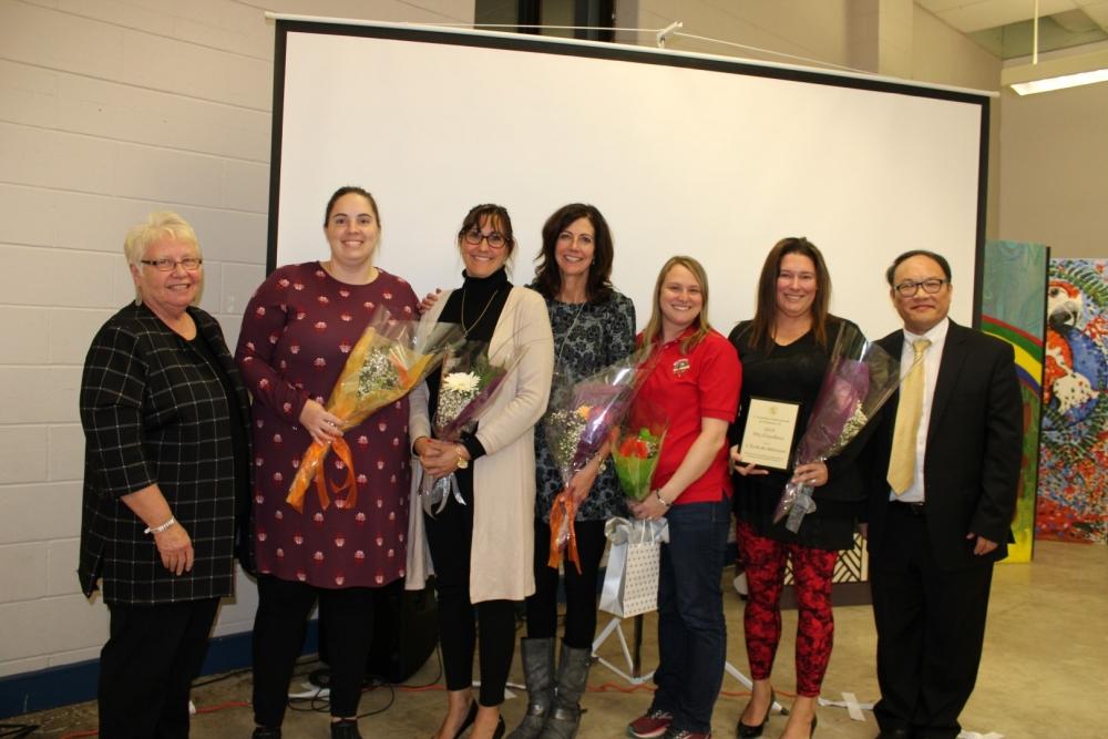 De gauche à droite, on voit Anne Soucy, première vice-présidente du conseil d’administration de l’AMCF ; Michelle Poirier, enseignante de 4e année ; Mireille Gaudet, enseignante d’appui à l’apprentissage ; Angèle Doucet-Léger, enseignante de 2e année ; Mélanie Dumas, enseignante d’appui à l’apprentissage ; Sylvie Legault, directrice ; et Bin Zhang, PhD, président du conseil d’administration de l’AMCF.