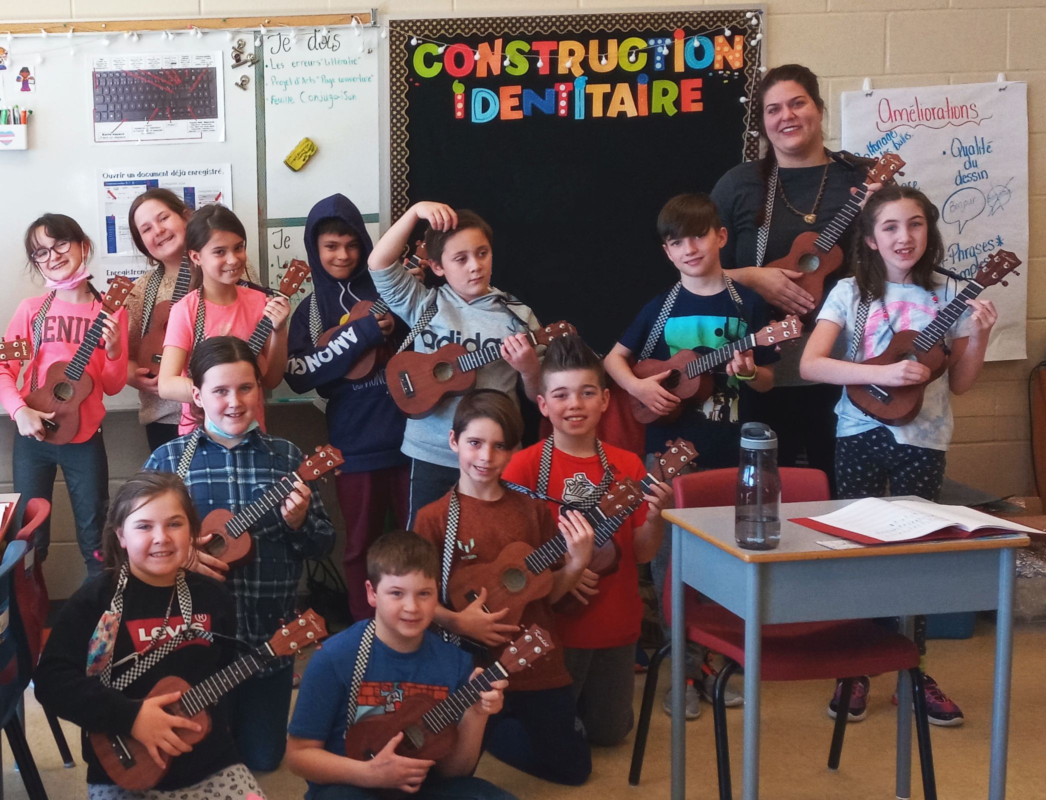 Moncton, le 15 juin 2021 – Avec l'aide de l’enseignante de musique, madame Danielle Leclerc, les élèves de la 4e et de la 5e année de l'école Sainte-Bernadette, de Moncton, ont appris et interprété des chansons traditionnelles à l'aide de ukulélés et d’instruments de percussion variés. Les pièces choisies par les élèves sont des chansons qu'ils ont apprises à la maison, soit de leurs parents ou grands-parents. Ils ont choisi des chansons traditionnelles qui représentent bien la culture de notre région.
