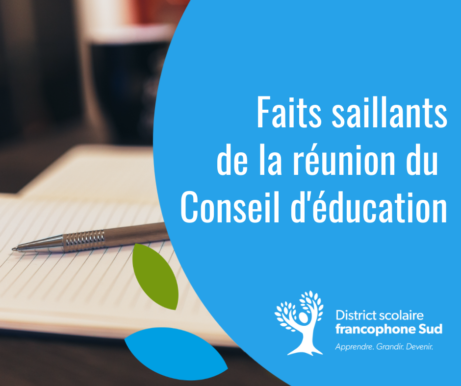 Dieppe, le 16 septembre 2021 - Voici quelques faits saillants de la 91e assemblée ordinaire du Conseil d’éducation (CED) du District scolaire francophone Sud (DSFS) tenue le mercredi 15 septembre 2021, à Dieppe. Il s’agissait de la première assemblée ordinaire du Conseil d’éducation depuis son assermentation, le 25 août dernier.
