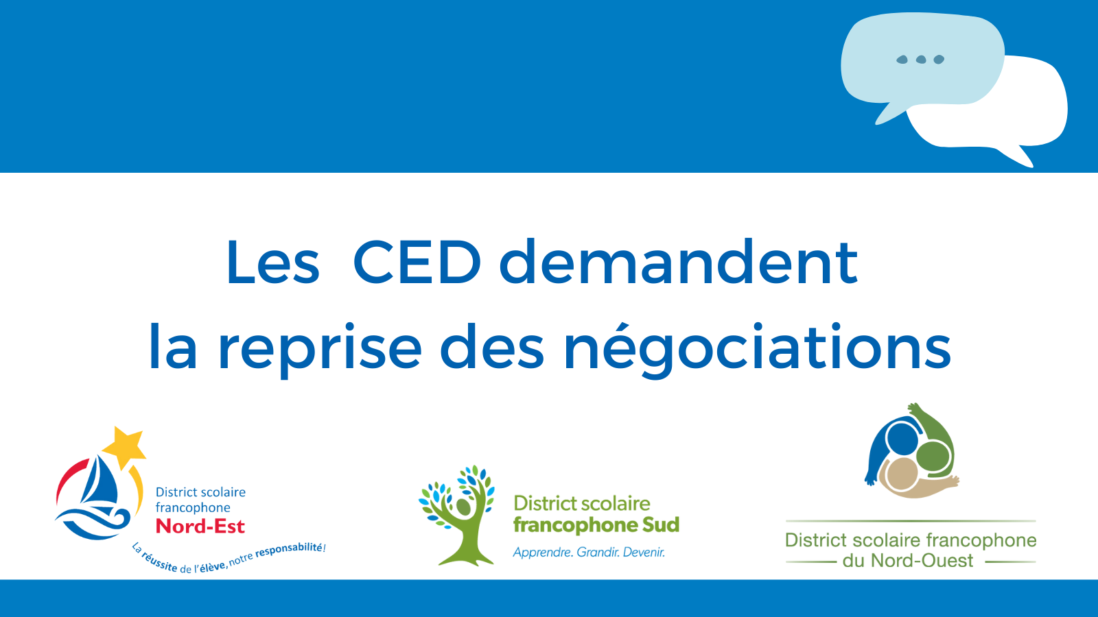 Dans une lettre envoyée au premier ministre Blaine Higgs, ce mercredi 3 novembre 2021, les présidences des conseils d’éducation, soit Francine Cyr (DSFNO), Ghislaine Foulem (DSFNE) et Michel Côté (DSFS), expriment leurs préoccupations face aux conséquences néfastes de la grève sur les élèves et les familles.