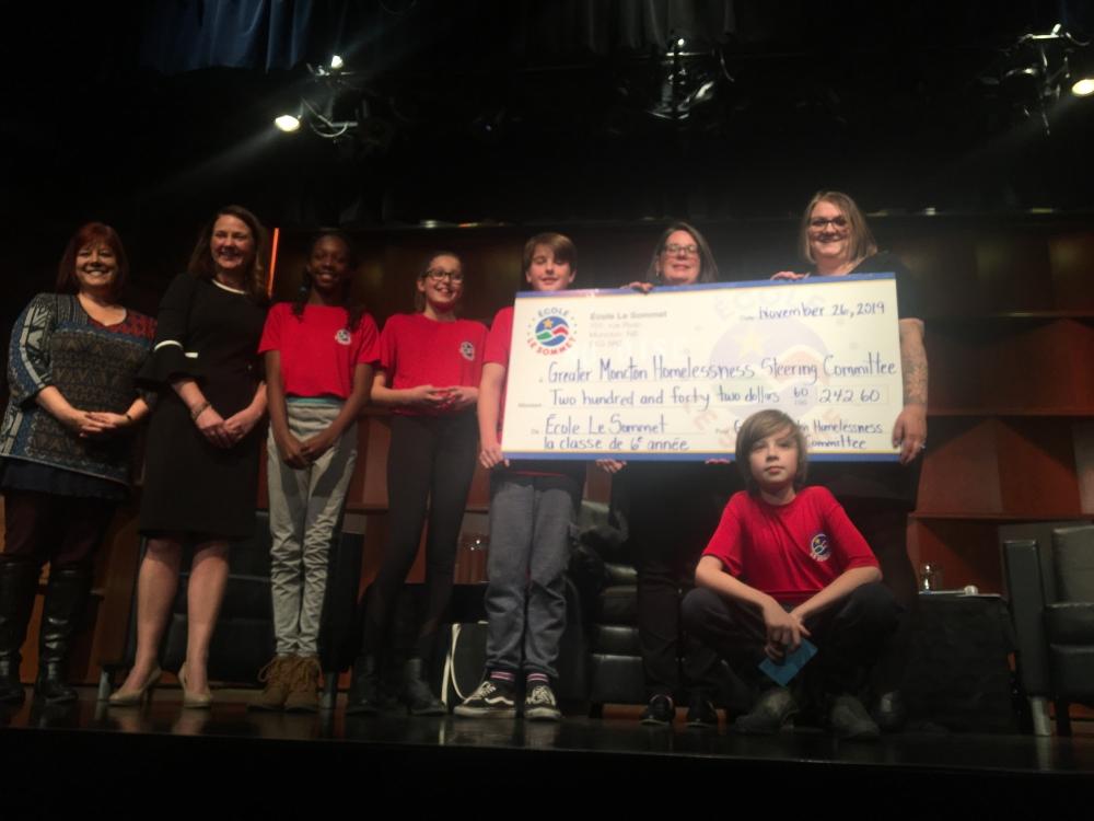 Moncton, le 2 décembre 2019 – Des élèves de 6e année de la classe de madame Dacia Robertson de l’école Le Sommet, de Moncton, ont présenté un chèque de 1 442,60 $ au Comité directeur des sans-abris du Grand Moncton, le mardi 26 novembre 2019, à l’occasion de l’événement « Parlons de l’itinérance ».